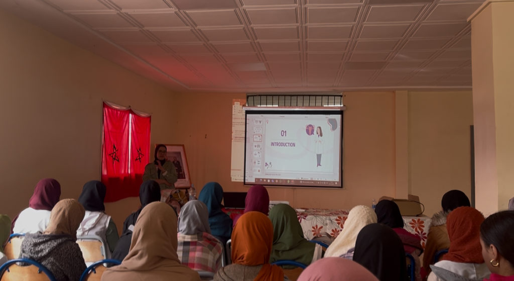 Direction Ait Mhamed avec le projet La Montagnarde, un atelier organisé par l’ONU. Une sage-femme est intervenue pour sensibiliser les jeunes filles de 16 ans aux menstruations. Nous avons également participé à la distribution de serviettes hygiéniques réutilisables, un geste concret pour leur bien-être et leur éducation.